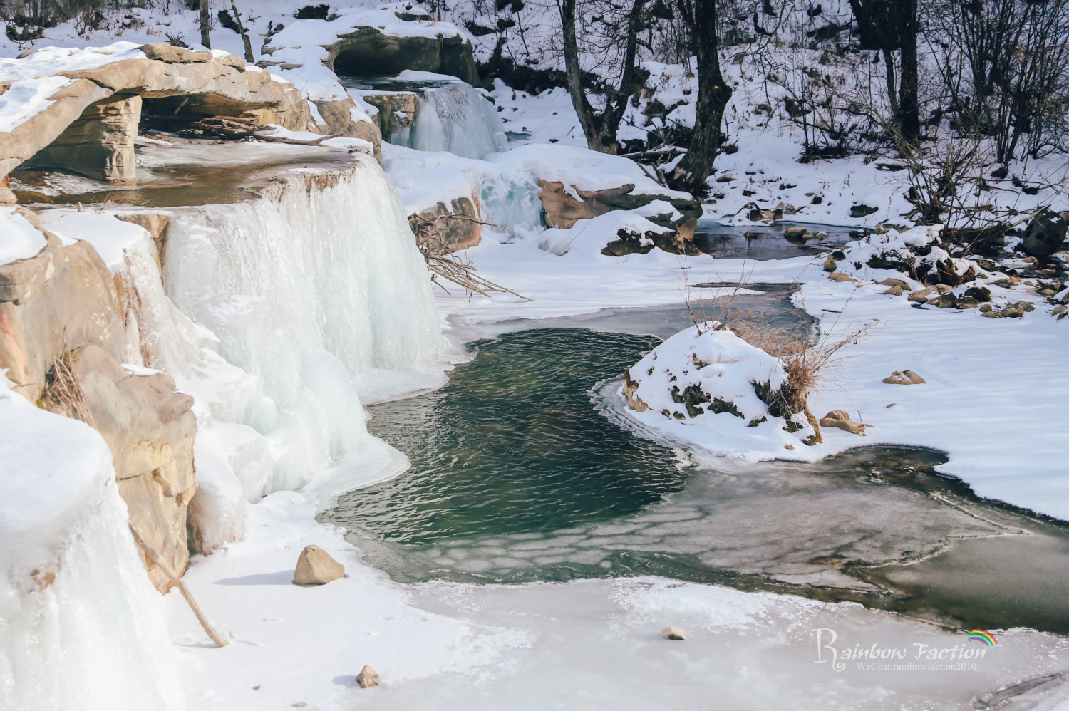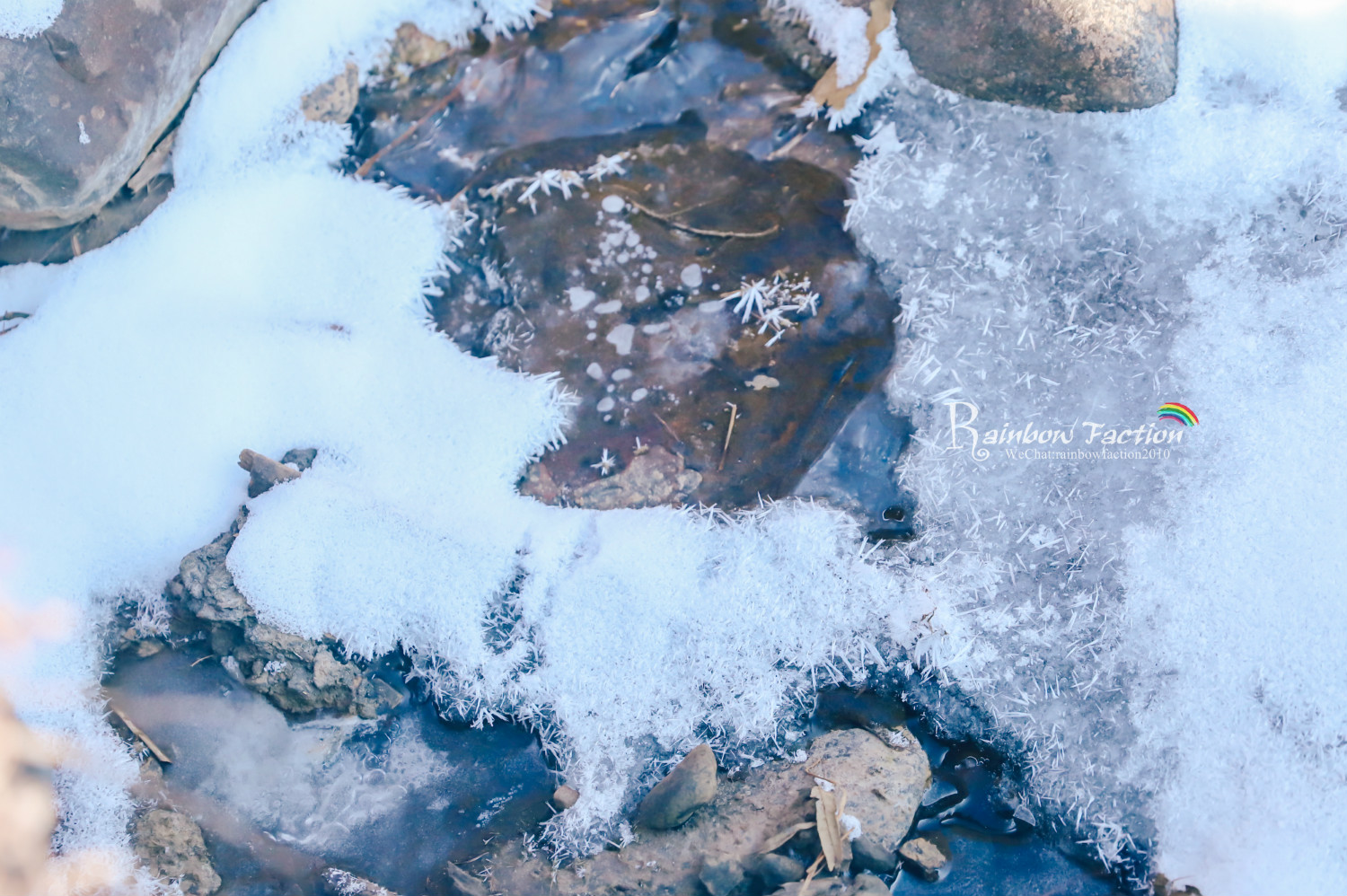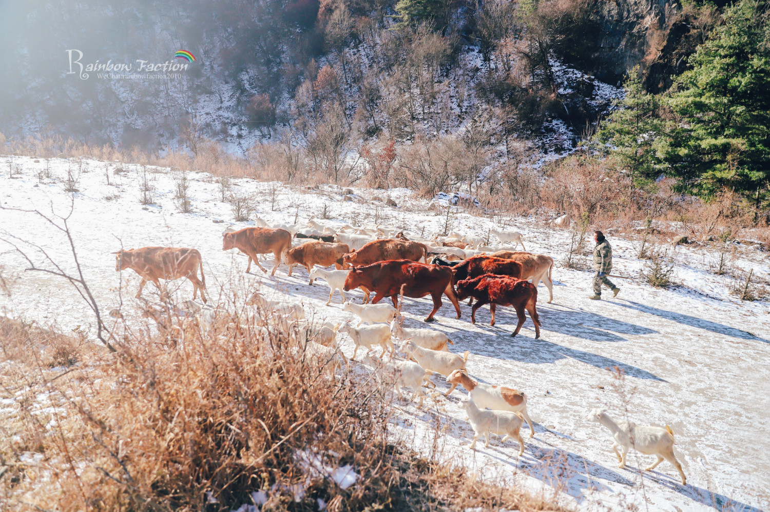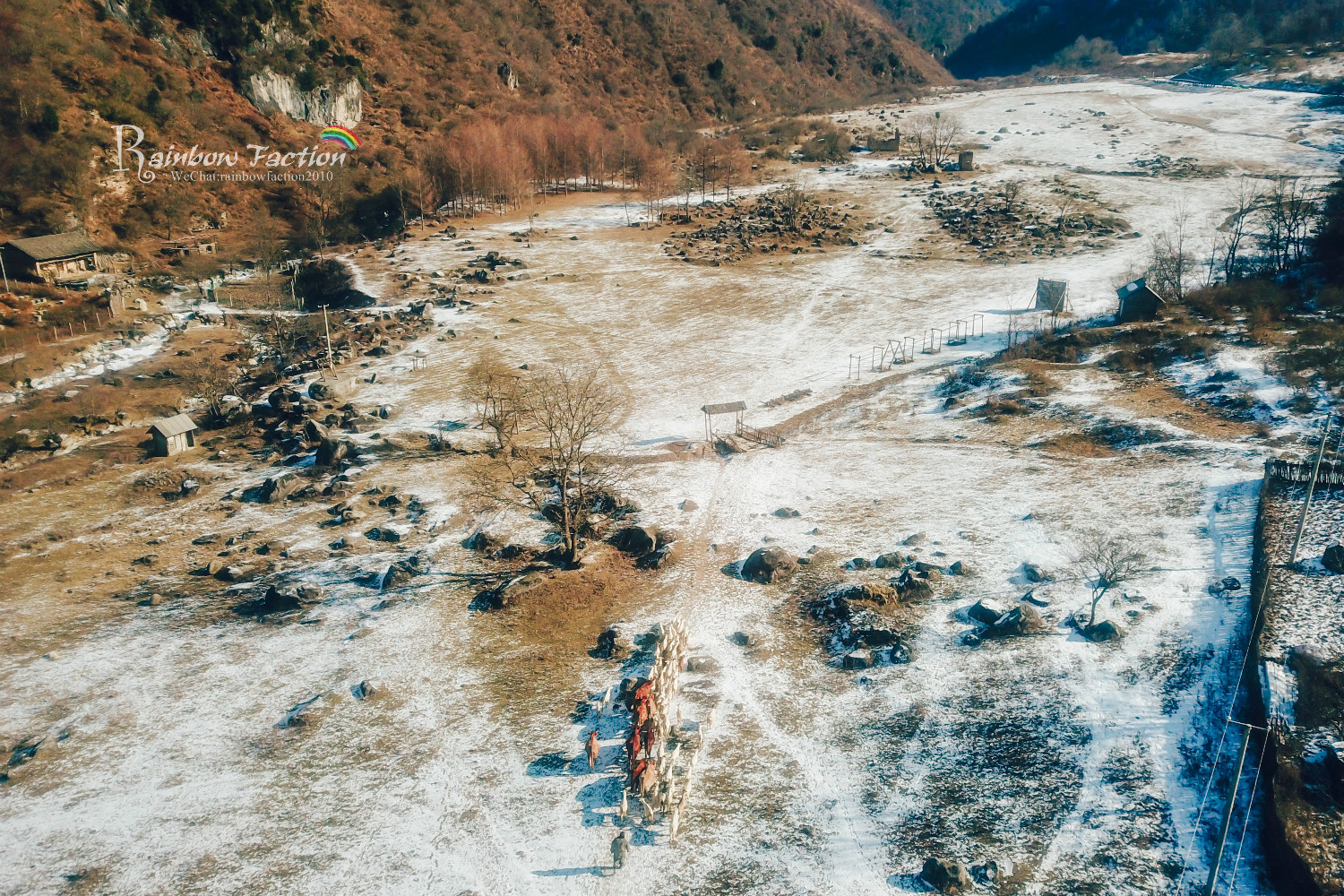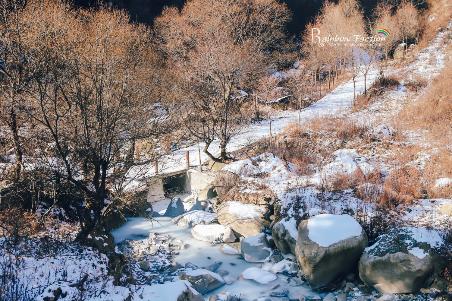 谷底安静得出奇,只有偶尔传来的一两声鸟叫,踏雪前行的脚步声和溪水融化川流而过的声音。