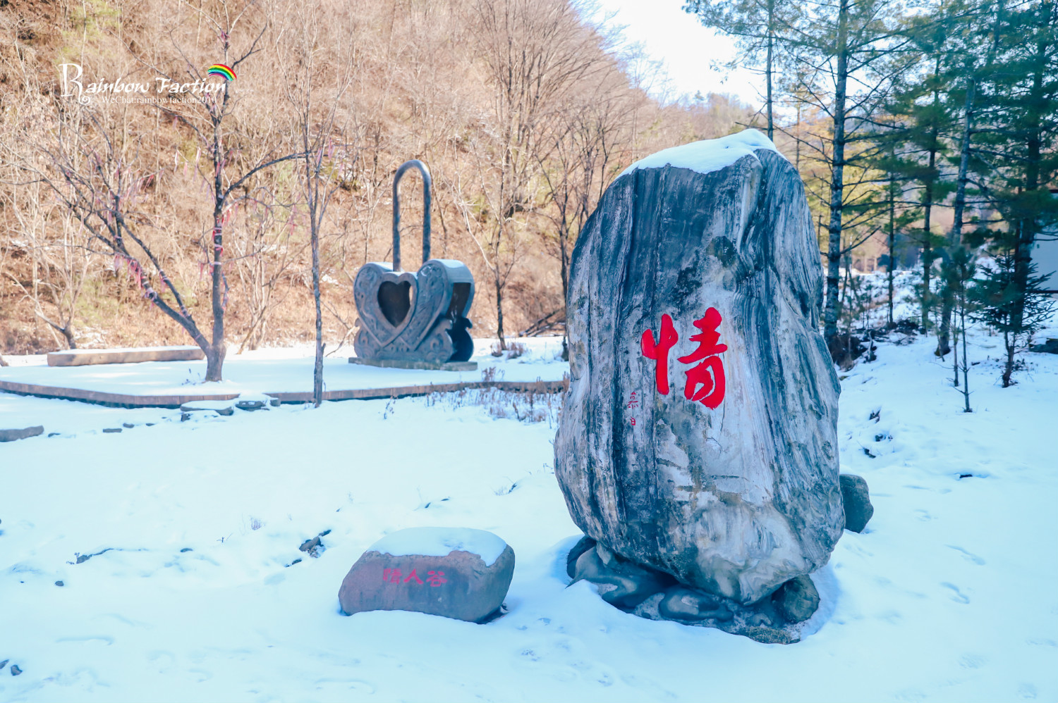 山顶的雪厚到可以直接没了脚踝,而山脚下的情人谷,便是秦岭雪乡的冰雪世界中温情浪漫的存在。