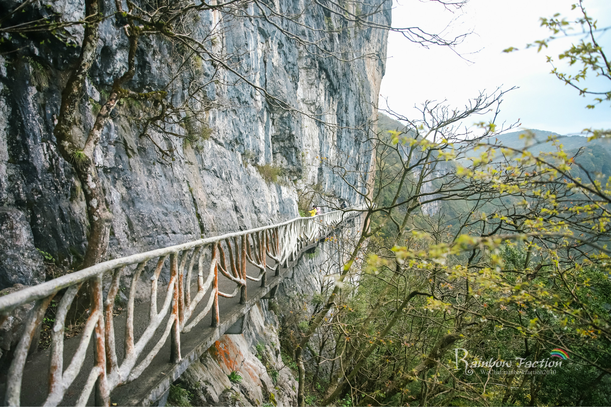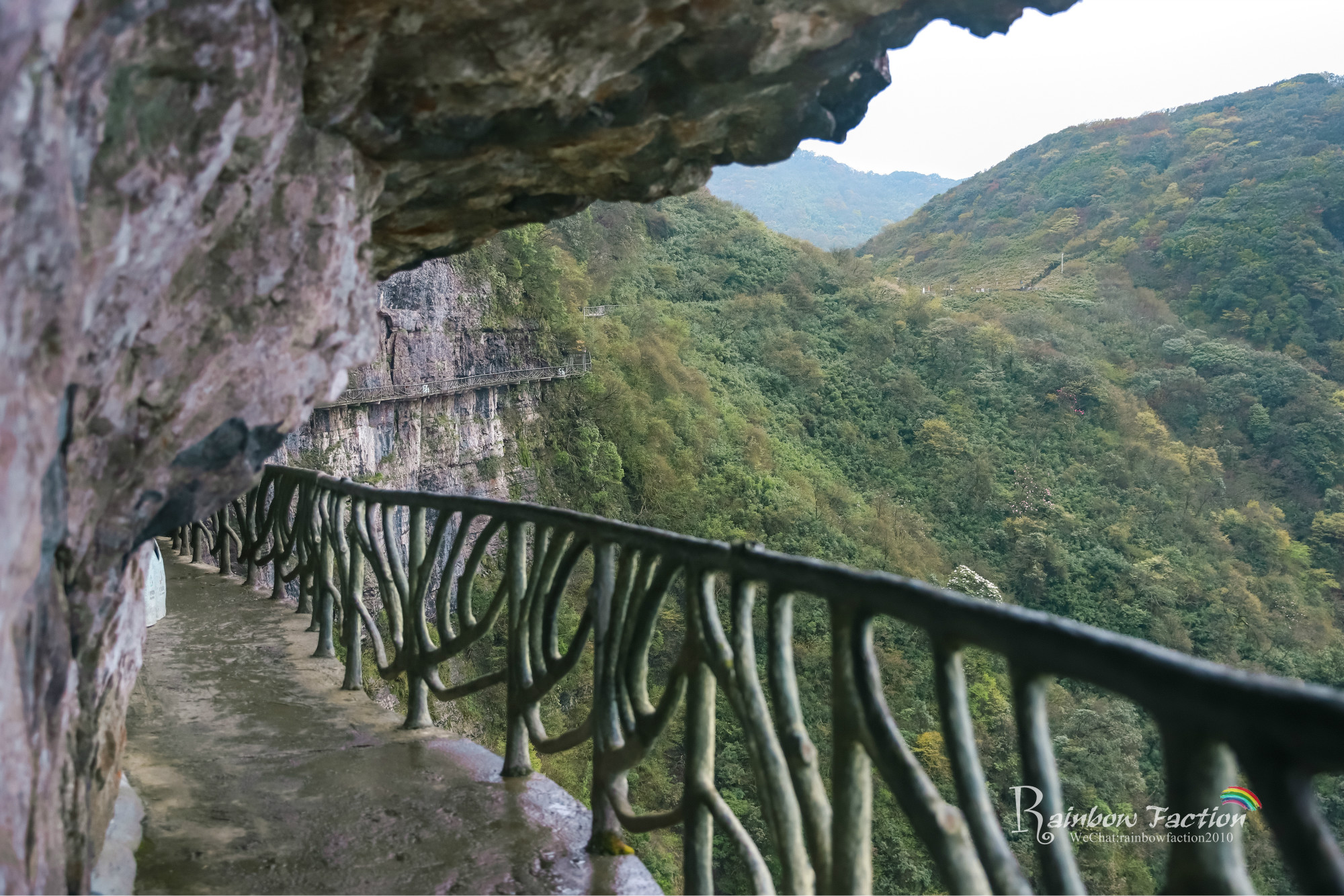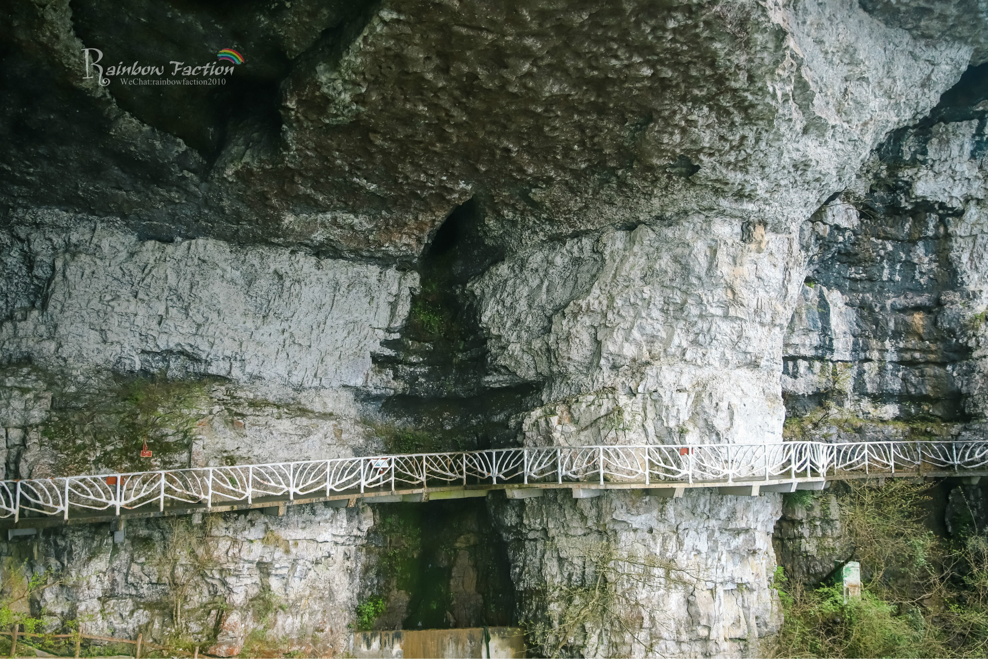 栈道离地面近百米,行走时如凌空微步,步步惊心。悬崖边还不时刮起阵阵“回旋风”,眼见着落叶被风从下至上吹起,不得不惊叹大自然的神奇。