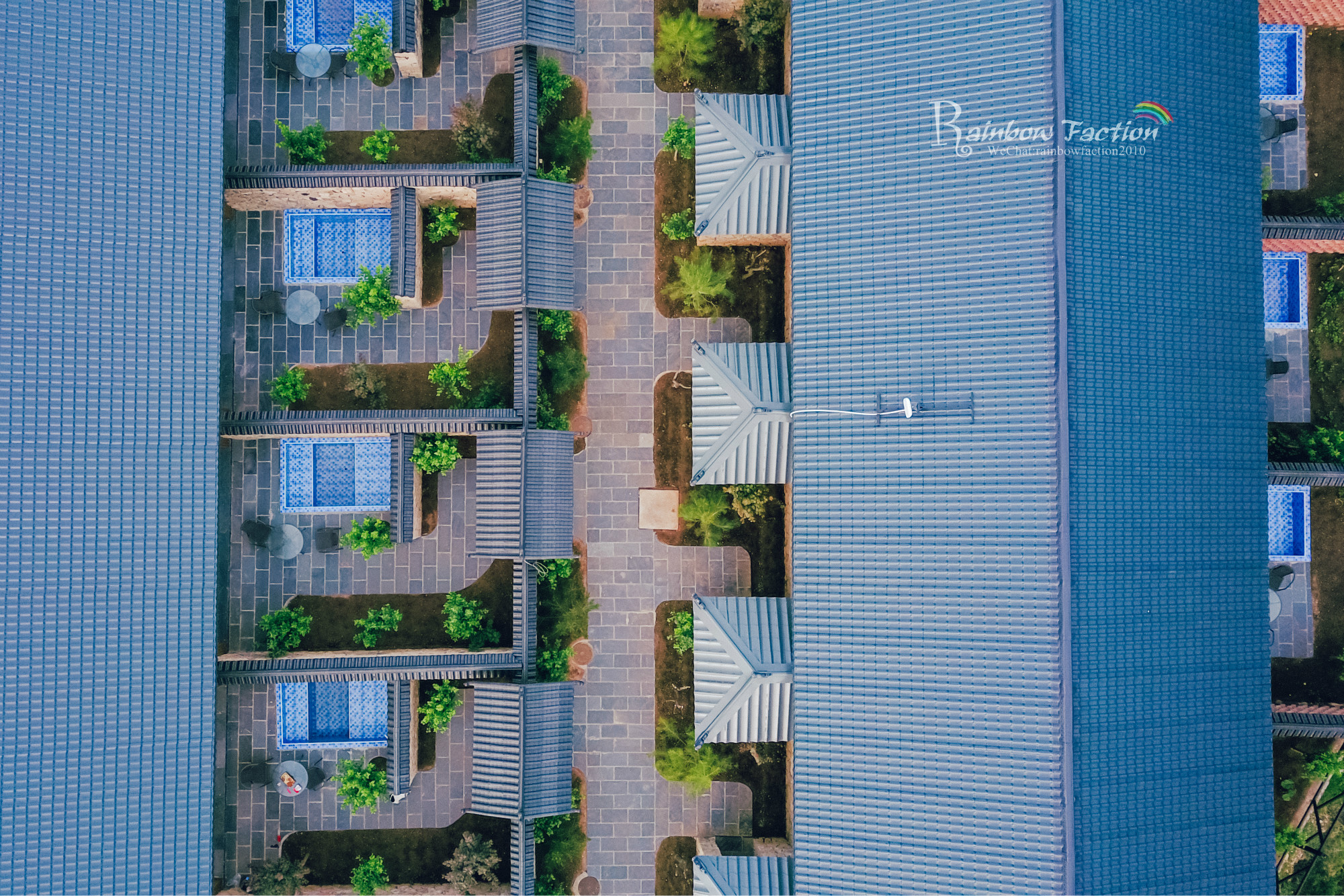 旁边的二号院是由十个独立院落组成的空间。每个围墙小院里都配有泳池,树荫下喝茶畅聊,别有一番洞天。
