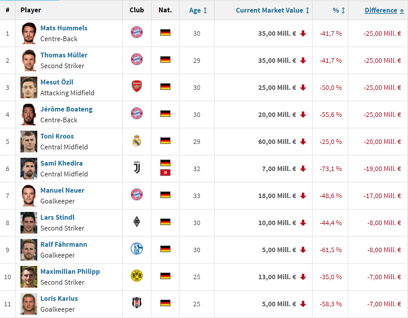 退出国家队的胡梅尔斯、穆勒、厄齐尔和博阿滕本赛季身价均下跌2500万欧,在德国球员身价跌幅榜中并列第一。克罗斯、赫迪拉、诺伊尔等名将也出现了身价大跌的情况。德甲联赛中文官网https://c1.hoopchina.com.cn/uploads/images/20190620/12/fa72949fbd0396d443bfe78e4bd40e97.png