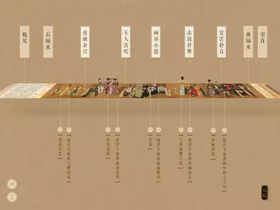 观众轻轻触动屏幕,指尖所至之处,似乎有烛光追随,移动“烛光”,人物、用品的名称、典故一一呈现……特别是在画中的点睛之笔之处,轻触屏幕,画中人立即“活”了起来,乐伎轻扫琵琶、舞伎翩翩起舞,画与真实的界限瞬间模糊起来,令体验者纷纷称奇。