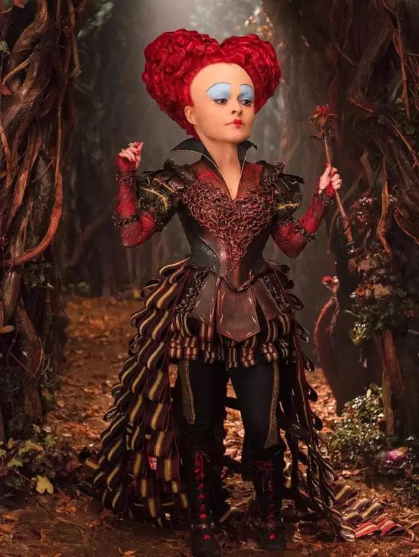 红皇后在第二部里的造型是这样式儿的,比第一部看起来酷了不少,毕竟从裙子换成了裤子,但是整体造型风格还是没有改变——
