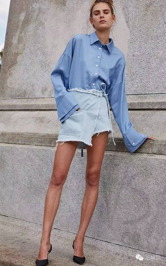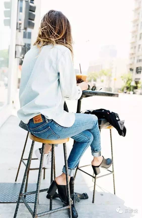 衬衫的半角、衬衫的前半部分或者直接把衬衫随意塞进腰间,可以提高腰线,而且大一号衬衫的宽松感会增加时尚度。