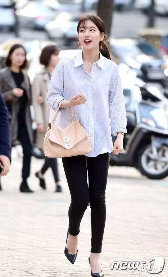 相比较其他博主的街拍LOOK,秀智的officelady搭配,看上去却很清新,随意的扎起低马尾、揭开领口的扣子露出精致的吊坠、简单的挽起袖口露出中性的手表、色彩柔和的手拎包、最简单的黑色细高跟...其实处处都是心机!