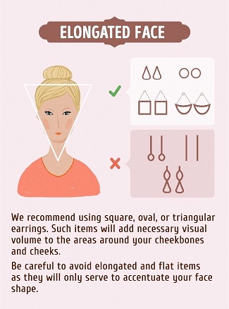 长脸适合方形的、椭圆形或三角形的耳环。这种宽的耳环能修饰你的脸型,增加你脸颊的宽度,从视觉上修饰长脸。要注意的是一定要避开细长的耳环,这种类型的耳环只会让你的脸看上去更长。