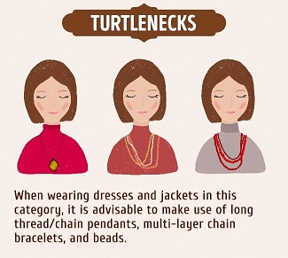 如果你的裙子或外套是高领的,那么久建议佩戴一些长的能垂下来的垂饰,或者多层层叠的珠子项链,重点是项链要长到能垂下来。