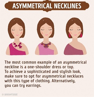 不对称领子最常见的就是只露单肩的样式。为了达到精致而又时尚的效果,你可以选择同样不对称的项链,或者你可以直接选择佩戴耳环而不是项链,这也是一个不错的选择。