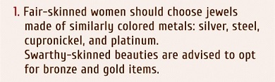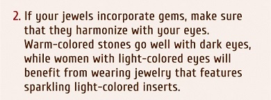 如果你要选择有宝石的饰品,那么最好要选择与你眼睛颜色相符合的宝石。暖色调的宝石适合黑色的眼睛,而冷色调的则更适合浅色眼睛的人。