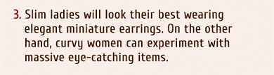 身材比较苗条的人适合带着让自己更优雅的小型的耳环,而身材较丰满的人则适合抢眼的大耳环。