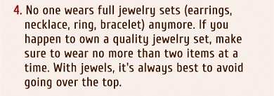 没有人会一口气把全身饰品都佩戴上(耳环、项链、戒指、手镯)。如果你有一整套的珠宝套装,但是你最多也只能一次带两个在身上,最好都不要一口气把全部挂在身上,这样会显得很浮夸。