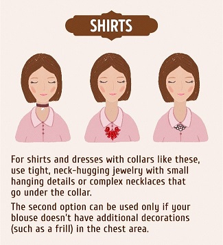 对于衬衫或者有衬衫领的裙子,可以佩带有小饰品的颈链或是让有复杂图案的项链配戴在领子下,第二种方式只适用在领子本身没有装饰(如褶边)的衬衫上。