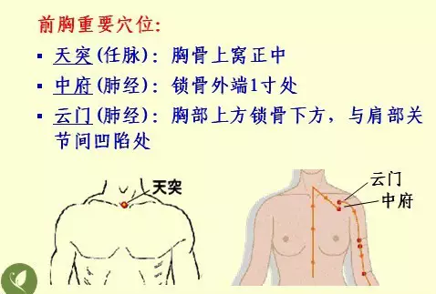 前胸:天突(任脉)、中府(肺经)、云门(肺经)