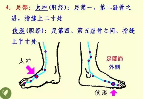 足部:内侧——太冲(肝经) 外侧——侠溪(胆经)