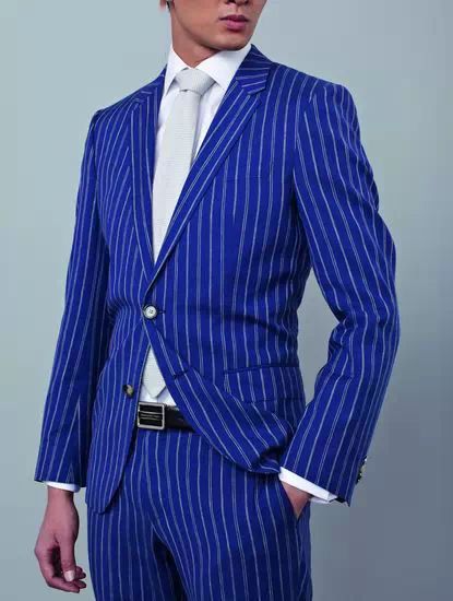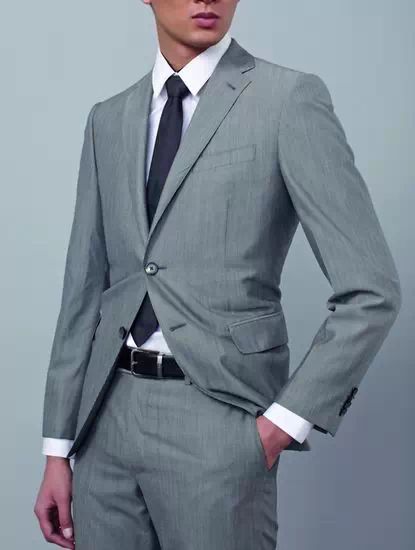 经典的灰色西服套装搭配方扣腰带是商务造型的经典。