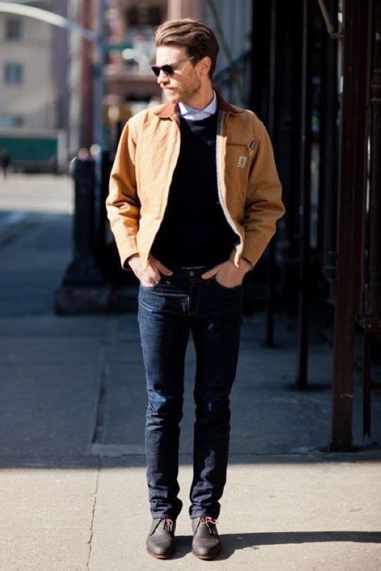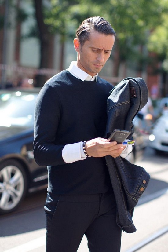 想要迎合学院风的审美,可以把你的牛津衬衫穿在里面,搭配Chino裤和开车鞋,或者更都市一些,慢跑鞋和长款衬衫。总之,把套头衫穿对味,再刁钻的眼光也无所畏惧。