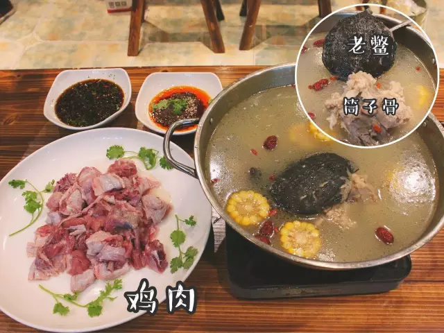 ▼这个菜名就很霸气,老鳖和筒子骨熬制的汤底又香又浓,再加入切好的鸡肉,煮熟蘸料一起享受,好吃好吃!