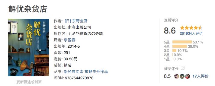 众所周知,《解忧杂货店》是一部非常畅销的小说。自2014年引进中国以来,就在各大图书畅销榜上名列前茅,收获的读者口碑也都很好,豆瓣图书的评分高达8.6分,是一本既受欢迎也受好评的书籍。