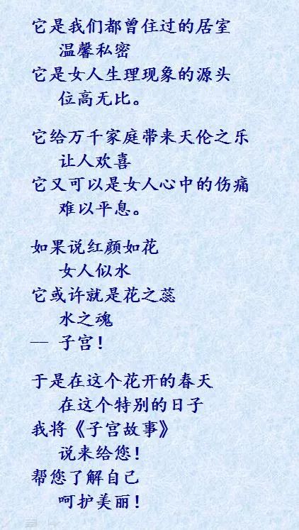 最后,希望这三集《子宫故事》能帮助女人认识自己,能提醒男人关爱女人。让更多女性拥有健康,让更少家庭留下遗憾---这是我2018年妇女节给阿姨和姐妹们的祝福。