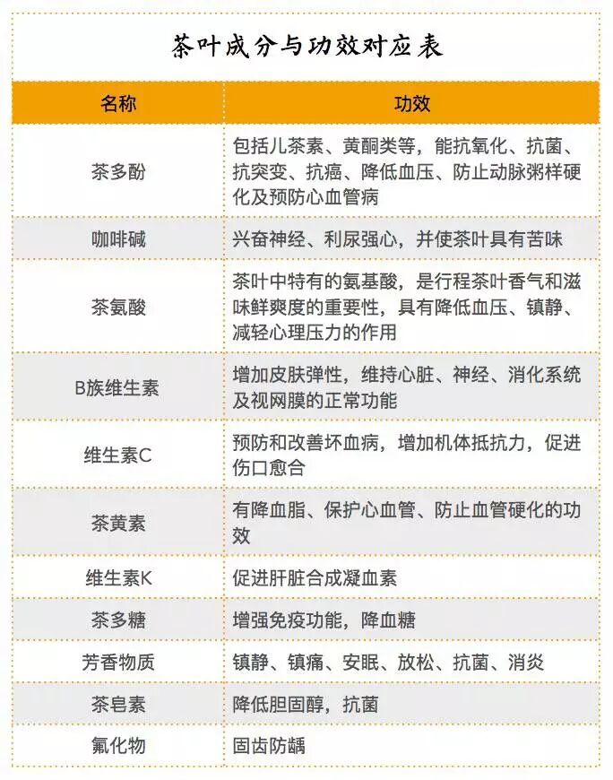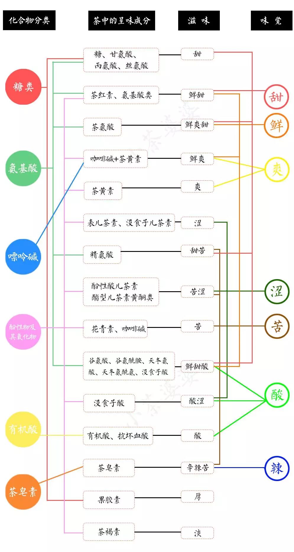 我们想要知道一杯茶里什么是甜的,什么是苦的,就要先知道一片茶叶里到底有什么,如下图: