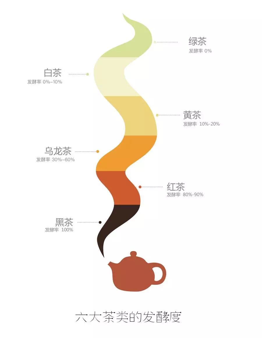茶叶的发酵度。简单来说,发酵度反映了在制作过程中新物质产生的多少,发酵率越高,内含物质转化得越多越彻底,发酵率越低,茶越接近自然状态。比如说,绿茶是直接高温杀青的,茶叶中的物质被直接固定在那个状态不变化了,所以发酵度为零。