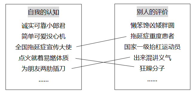 然后我们把第一个实验的“自我认知”与第二个实验的“别人对你的评价”进行对比。