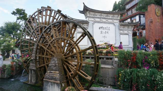 丽江古城内的街道依山傍水修建,铺的大多都是红色角砾岩,雨季不会泥泞、旱季也不会飞灰,石上花纹图案自然雅致,与整个古城环境相得益彰。位于古城与新城交界处的大水车是丽江古城的标志,古城大水车旁有一块大屏幕,每日播放的歌曲即是古城最受欢迎最有特色的歌曲。