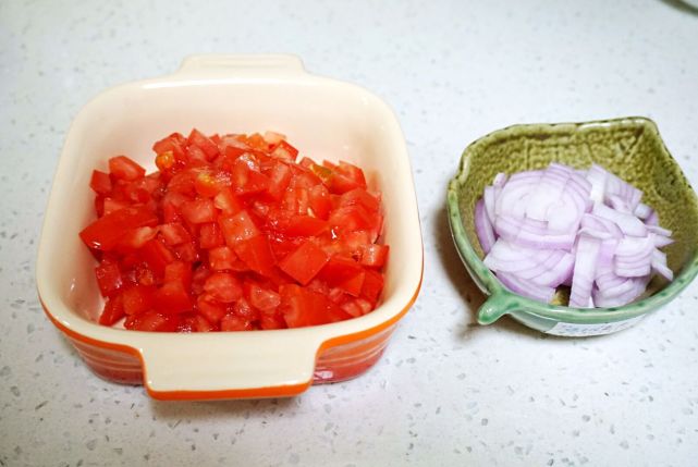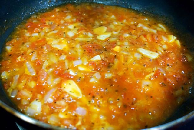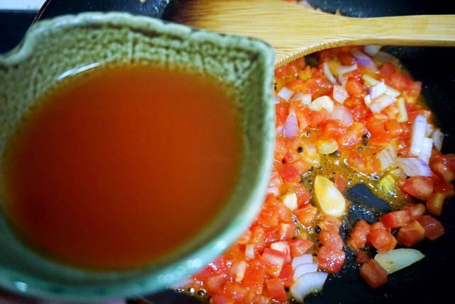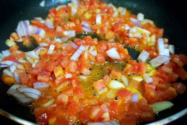 接着放入番茄丁,先煸炒出汤汁,番茄变软,再入洋葱,倒入适量盐和罗勒叶香料。