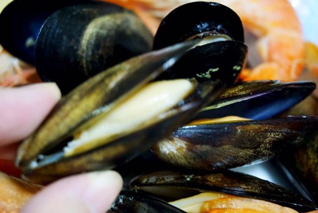 3、青口贝(如果没有用花蛤),洗净;鲜虾去虾脑虾线洗净备用。