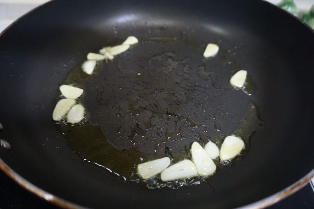 4、蒜切片,坐热平底锅,放入适量橄榄油,爆香蒜片。