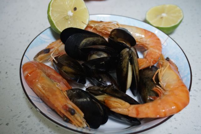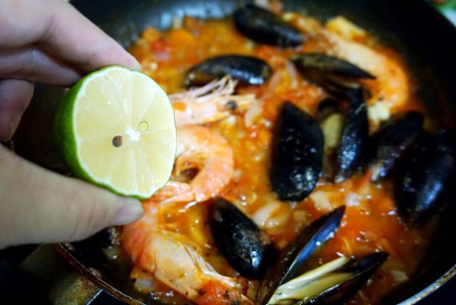 6、放入鲜虾和青口贝,根据口味加入适量糖。最后挤入适量青柠汁,相信我,味道超级赞,会有特别清新和芳香的口感。