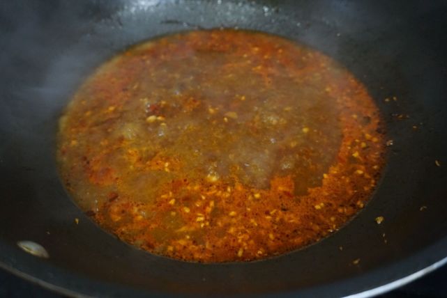 2、锅内放油,烧热后,放入葱姜蒜末,快火爆香,接着倒入一大勺的郫县豆瓣酱,炒出红油,倒入1勺生抽,接着倒入开水。