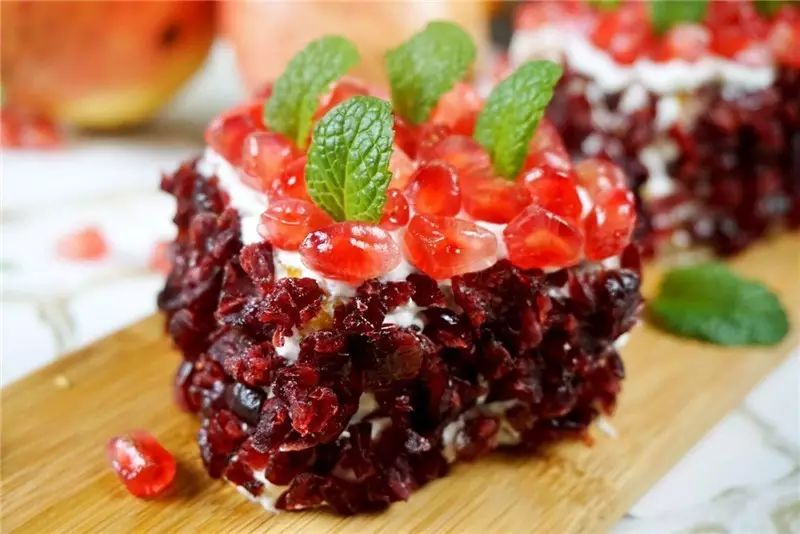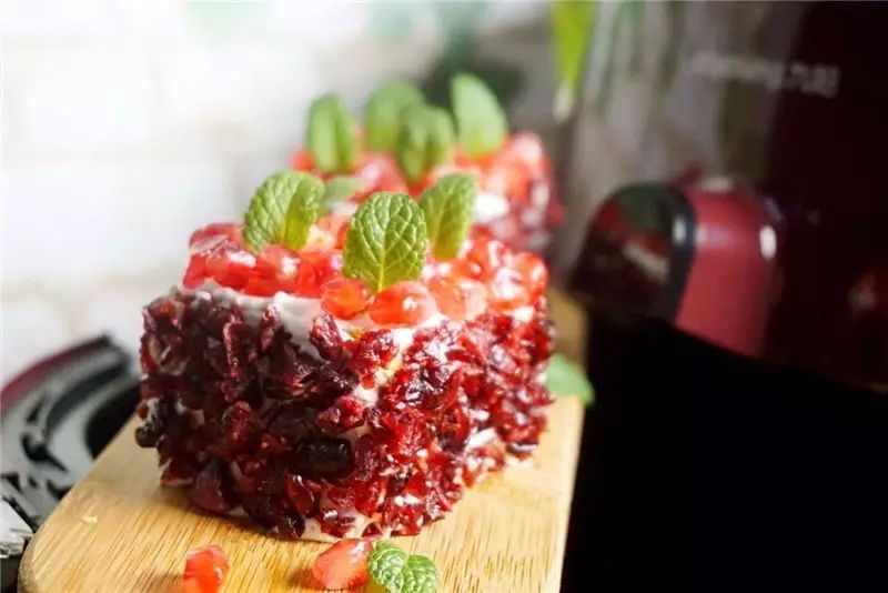 9、接着在四周均匀都涂抹上淡奶油,把蔓越莓碎粘在四周,顶部放上剥好的石榴。