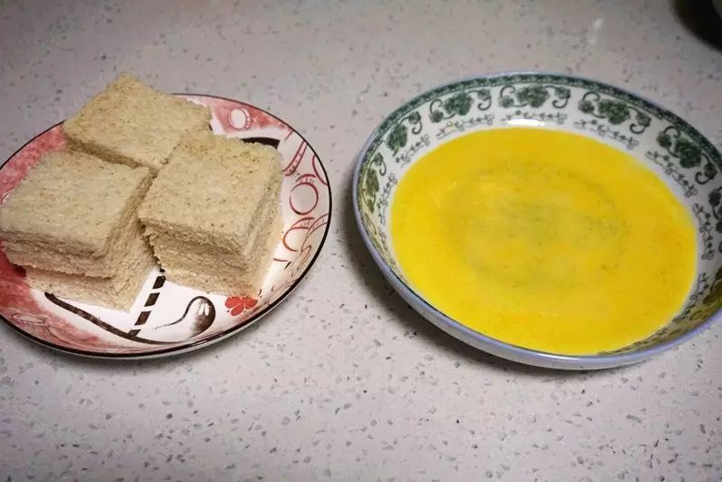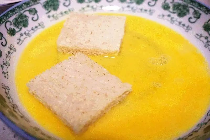 3、两个鸡蛋打散,过筛,每块土司都均匀沾满蛋液。