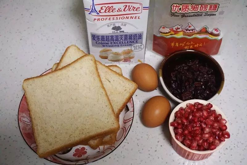 一开始只是想做个不放肉的奶酪土司,后来发现冰箱里蔓越莓还有好多,鸡蛋还孤零零的剩余两个,于是脑洞这时候刚刚好的大开,土司切块后包裹蛋液,烤到金黄色,晾凉后包裹奶酪片,四周涂上打发的淡奶油,沾上蔓越莓碎和石榴。当淡奶油慢慢渗透进土司中,混合着奶香和蛋液的土司片,香脆中透着绵软,还有层层的奶酪片,甜咸适中,是相当诱人的一款下午茶。