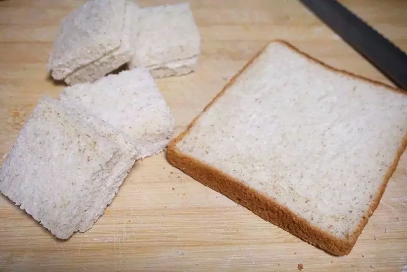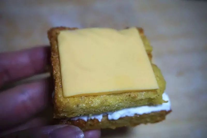 8、放一片干酪,涂抹一层淡奶油,不用太厚,再放上一块土司块,再放干酪片,再抹淡奶油,3块土司块的大小,食用正好。