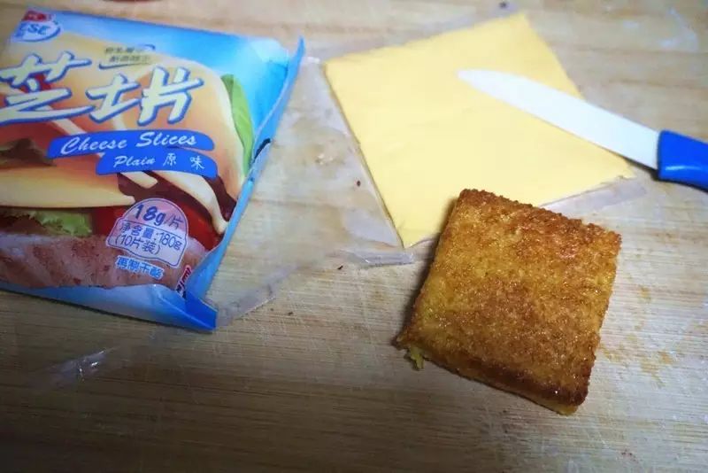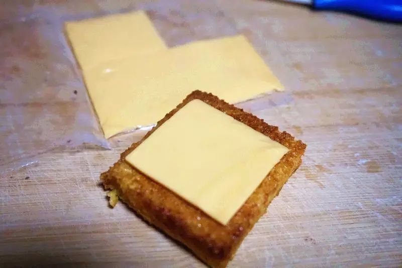 7、把干酪片一分为四,这种带有咸味的干酪片,奶香浓郁,很好吃。