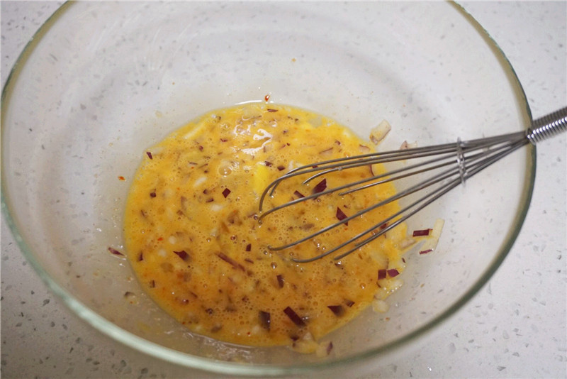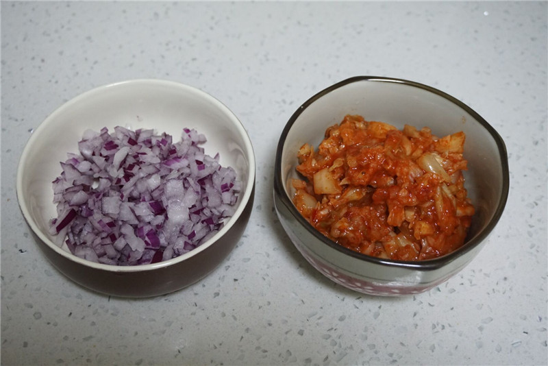 先把洋葱和辣白菜切小丁,不要太碎,有颗粒,口感才有丰富的层次感。