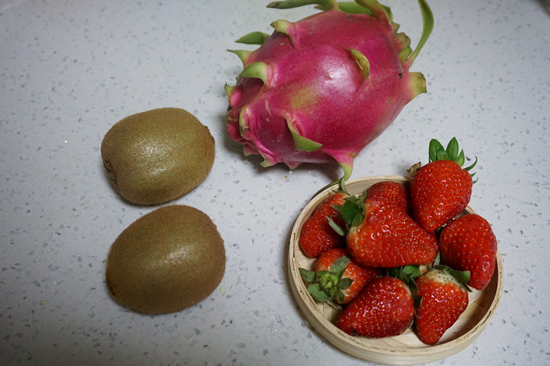 4、火龙果、猕猴桃、草莓都洗净切小碎丁,还可以用芒果、菠萝、苹果,选择家人爱吃的水果就行。
