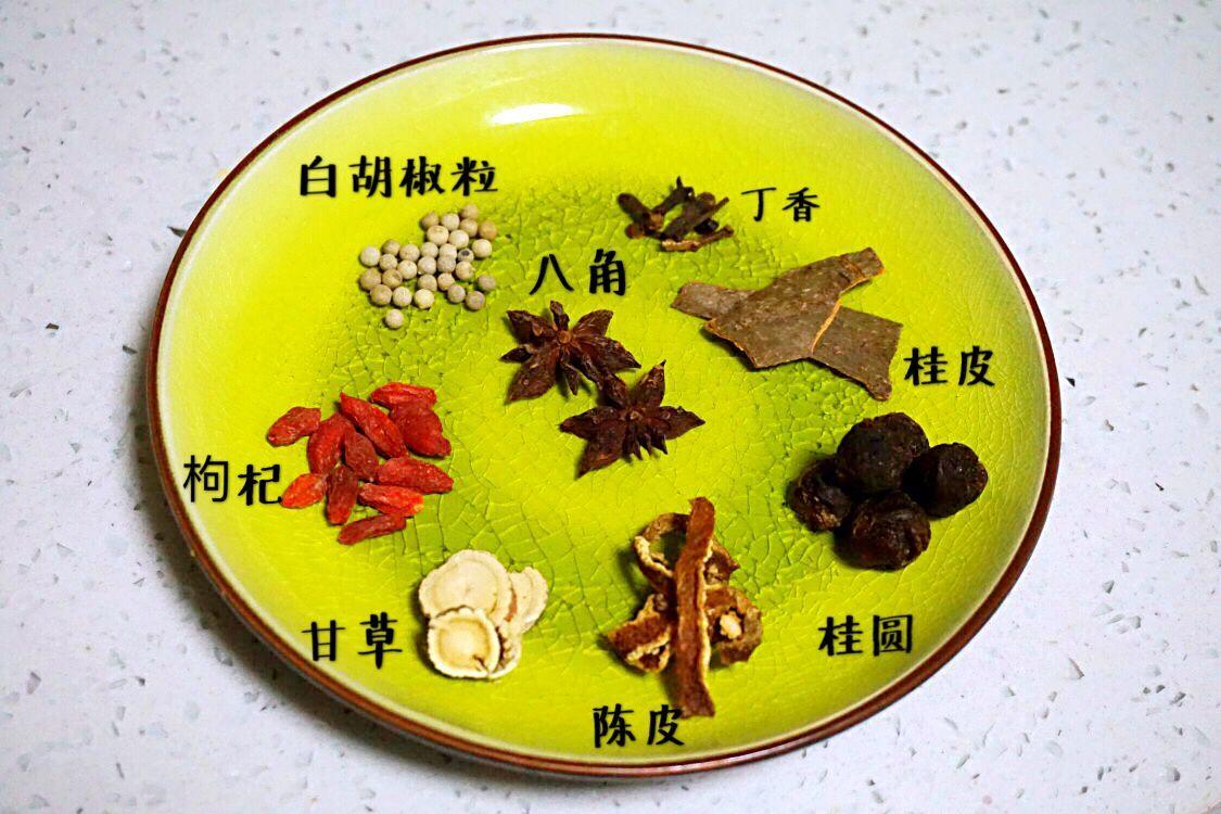 香料:桂皮、丁香、白胡椒粒、枸杞、八角、甘草、陈皮、桂圆干、枸杞