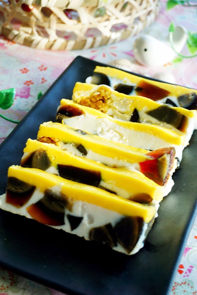 7、蒸好的三色蛋羹取出来晾凉,凉透后切片装盘。