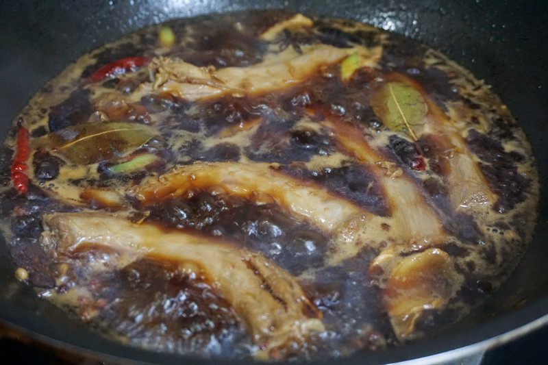 6、加入没过鸭脖的沸水,大火煮沸后就转中火,盖盖子焖煮到收汁。