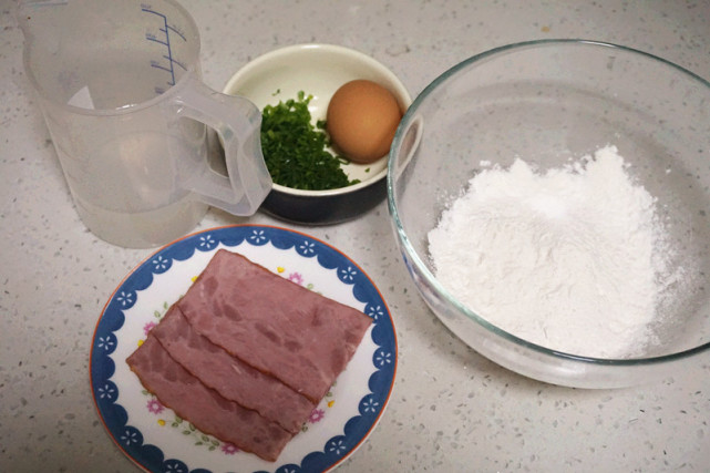 100克的面粉配150克的水,这个配比比较准确的,我做过多次。最后放入培根丁准备油煎。