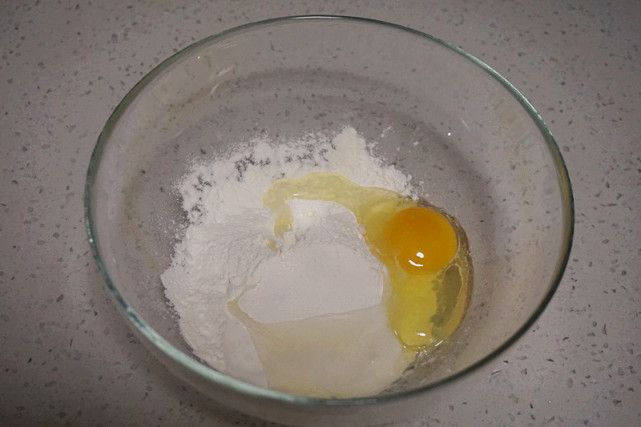2、面粉里倒入一个鸡蛋,适量清水,用打蛋器一个方向搅拌均匀。