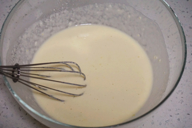 5、平底锅选用不粘锅,刷上薄薄一层油,油一定不能多了,然后倒入搅拌好的面糊。这个量,能做两种面饼。