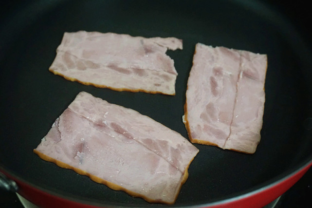 3、培根放在平底锅里煎熟,切成小丁备用。