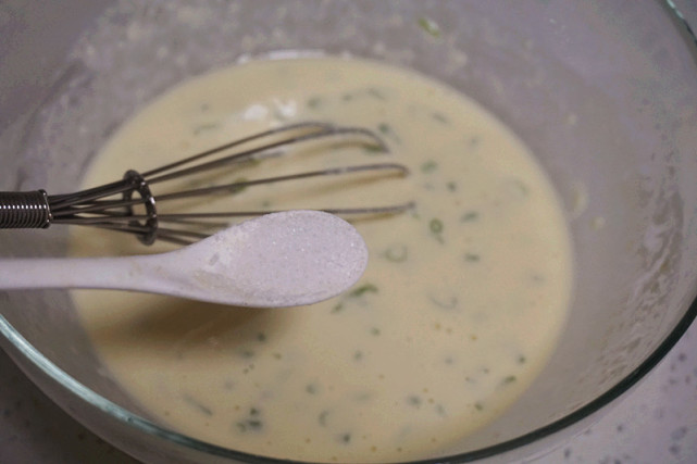 4、面糊里倒入香葱末,再加入半小勺盐,这样不仅是调味,更让做出来的面饼有嚼劲又松软。