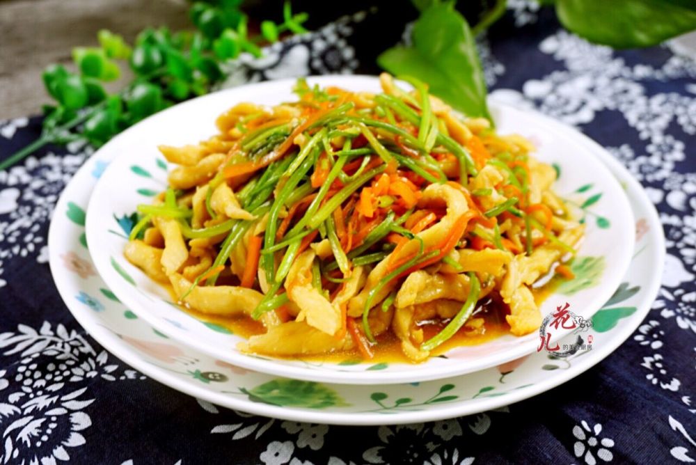 2、炒菜也要看色泽,这红配绿的颜色,鲜艳又营养丰富,则是加了胡萝卜丝。要知道其中的β-胡萝卜素,需要和脂肪结合才能促进脂溶性维生素的吸收,所以胡萝卜炒着吃才能促进营养吸收。