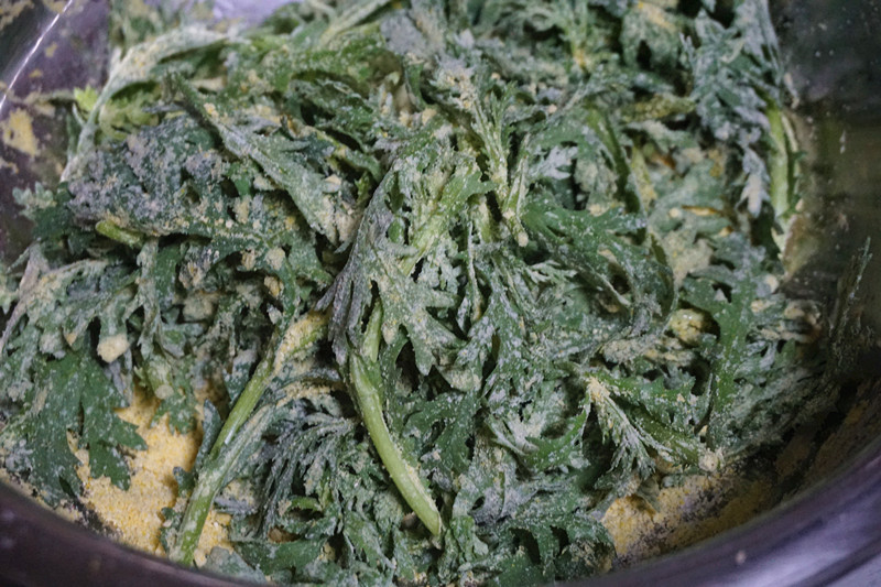 混合了玉米面的茼蒿,蒸熟后绵软顺滑,味道鲜美,蘸汁吃尤为香,还具有特别有效的清肠排毒作用,这可是春季里减肥的上佳菜肴。