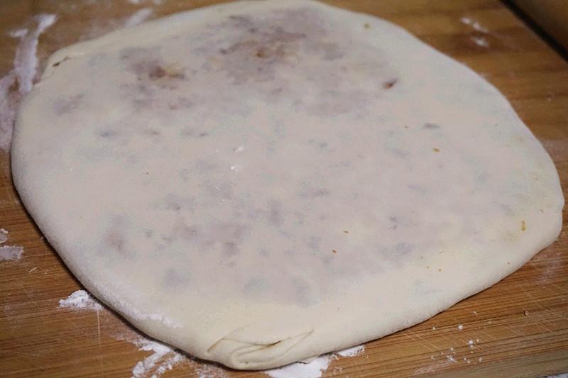 7、用擀面杖轻轻擀开,用力要均匀,一点点擀,否则很容易破皮的。